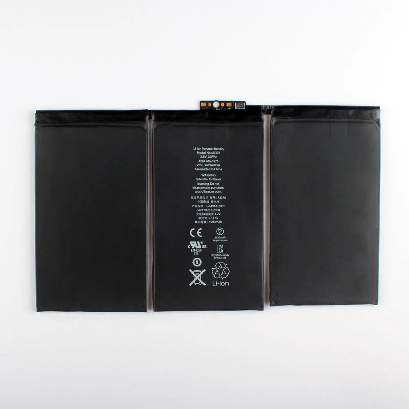 The battery is made with lithium-ion polymer cells, with a nominal capacity of 6500 mAh, 3.8 V and 25 Whr, which is equivalent to the original factory battery capacity of the iPad 2. This ensures identical electrical performance under standard conditions.