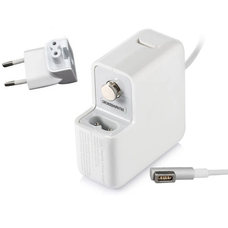 The compatible 45W MagSafe charger for MacBook Air is a power adapter designed specifically for this Apple laptop model. It features a magnetic DC connector that ensures safe disconnection in the event of accidental tugs, helping to prevent short circuits and premature cable wear.