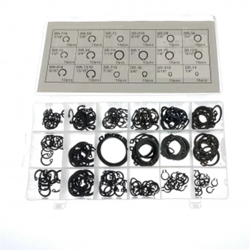 The kit contains 18 different sizes, from 1/4” (~6.35 mm) to 1-1/4” (~31.75 mm) nominal diameter. To choose the right one, you should measure the exact diameter of the shaft or housing and check compatibility with the diameter and groove, consulting the technical tables included in the box for tolerances and recommended clearance.